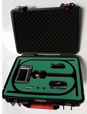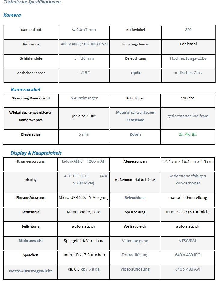 Koffer, Endoskop, Kamerakabel mit 2.0 mm Kamerakopf, Adapter für Videokabel, Netzkabel, USB-Kartenleser, wiederaufladbarer Li-Ion-Akku, Bedienungsanleitung