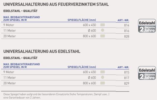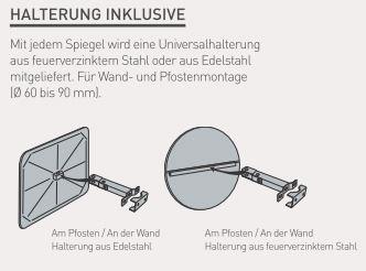 Edelstahl - Spiegel für spezielle Umgebungen Empfohlen an heißen, industriellen Standorten (Metallgießereien, Hochöfen...) oder in Umgebungen mit speziellen gesetzlichen Regelungen (Nahrungsmittelindustrie). 1 Halterung pro Einsatzort - Universalhalterung aus feuerverzinktem Stahl: Halterung aus feuerverzinktem Stahl für Wände und Pfosten mit Ø 60-90mm. Für Temperaturen bis zu 400° C. Universalhalterung aus Edelstahl: Speziell für die Nahrungsmittelindustrie. Respektiert sämtliche gesetzliche Regelungen der Nahrungsmittelindustrie. Einfache Reinigung ohne Risiko einer Materialverschlechterung. Halterung aus rostfreiem Edelstahl für Wände und Pfosten mit Ø 60-90 mm.