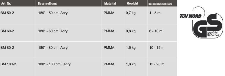 Der BM 180° Halbkuppelspiegel ist eine effiziente und platzsparende Investition in die Arbeitssicherheit. Der BM 180° besitzt ein brillantes Spiegelbild und kann somit im industriellen Bereich sowie in Werkstätten und Warenhäusern eingesetzt werden. Im industriellen Bereich schafft der BM 180° eine gute Übersicht und im Einzelhandel werden potentielle Ladendiebe abgeschreckt. Der Spiegel ist TÜV zertifiziert.