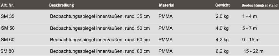 SM Beobachtungsspiegel Der SM Beobachtungsspiegel ermöglicht durch seine schwach konvex gewölbte Form einen guten Einblick über große Flächen und ist somit sehr gut für die Überwachung von Verkaufsräumen im Einzelhandel und in Warenhäusern geeignet. Zudem ist er TÜV zertifiziert. Material Der Spiegel wird aus schlagfestem Acrylglas hergestellt. Das besondere an diesem Spiegel ist die geschlossene Rückseite aus Kunststoff zum Schutz der Metallisierung. Der Spiegel ist dadurch sehr widerstandsfähig und langlebig. Zusätzlich wird er von einer umlaufenden Kunststoffumrandung vollständig abgedichtet und kann somit auch in der Lebensmittelindustrie verwendet werden. Befestigung Als Halterung wird ein verstellbarer Teleskoparm (30 - 50 cm) mitgeliefert. 2 Jahre Funktionsgarantie