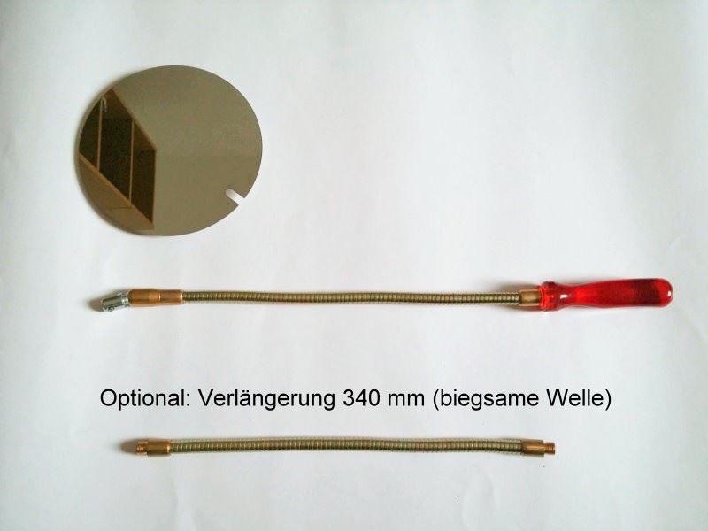 Dieser Spiegel ist zur Kontrolle von schwer einsehbaren Behältern gedacht. Die beigefügte biegsame Welle dient als Verlängerung und bringt eine Gesamtlänge von etwa 740 mm ohne Spiegel.