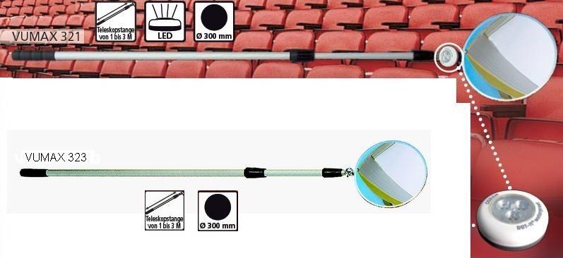 Art.-Nr.: 321 = Spiegel Ø 300 mm mit Teleskopstange von 1 bis 3 m mit LED-Lampe + Kugel unter dem Spiegel zum Aufsetzen