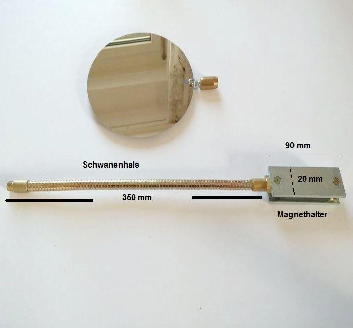 Metallspiegel verschiedener Größen können am Schwanenhals und der Magnethalterung verbunden werden. Der Schwanenhals kann auch noch verlängert werden.
