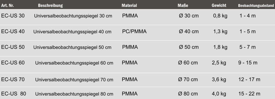 EC-US Spiegel Der TÜV-Geprüfte EC-US Universalbeobachtungsspiegel ist hervorragend zur Überwachung von Verkaufsräumen oder zur Produktionsüberwachung geeignet. Durch seine verzerrungsfreie und gute Bildwiedergabe lassen sich Diebstähle und Unfälle vermeiden. Seine verstärkte Rückwandschale ermöglicht einen problemlosen Einsatz im Außenbereich. Material Das Material, Acryl, sorgt für Bruchsicherheit und ist 70% schlagfester als Glas. Befestigung Der im Lieferumfang enthaltene Teleskop Wandarm ermöglicht eine einfache Montage und Einstellung des Blickfeldes. 2 Jahre Funktionsgarantie