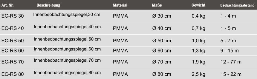 EC-RS Spiegel Der TÜV-Geprüfte EC-RS Innenbeobachtungsspiegel ist hervorragend zur Überwachung von Verkaufsräumen oder zur Produktionsüberwachung geeignet. Durch seine verzerrungsfreie und gute Bildwiedergabe lassen sich Diebstähle und Unfälle vermeiden. Material Das Material, Acryl, sorgt für Bruchsicherheit und ist 70% schlagfester als Glas. Befestigung Der im Lieferumfang enthaltene Teleskop Wandarm ermöglicht eine einfache Montage und Einstellung des Blickfeldes. 2 Jahre Funktionsgarantie