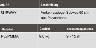 Der Subway Spiegel wird aus unzerstörbarem Polycarbonat hergestellt und ist damit besonders für Vandalismus gefährdete Bereiche und für den Außeneinsatz geeignet. Der Spiegel wird mit Silikon in einem stabilen Rahmen befestigt und ist auf der Rückseite verstärkt.