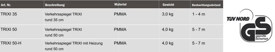 Der Trixi Verkehrsspiegel ist speziell für die Sicherheit von Fußgängern und Radfahrern entwickelt worden und bringt optimalen Einblick in den „toten Winkel”. Diese Verkehrsteilnehmer sind aufgrund des „toten Winkels“ besonders in Kreuzungsbereichen und an Fußgängerüberwegen gefährdet und benötigen eine zusätzliche Sicherheitsquelle. Den Kraftfahrern ist es so möglich beim Abbiegen den gefährlichen „toten Winkel“ einzusehen. Der Spiegel ist TÜV zertifiziert.