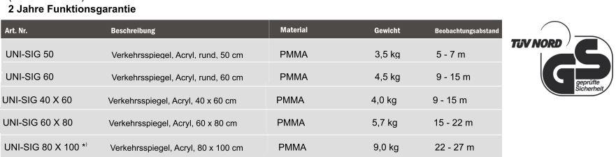 Der Uni-Sig wird aus Acryl (70% schlagfester als Glas) hergestellt und ist mit Reflexfolie Typ RA 2 von 3M ausgestattet. Auf Grund des robusten Materials ist der Spiegel für den langjährigen Außeneinsatz sehr gut geeignet.